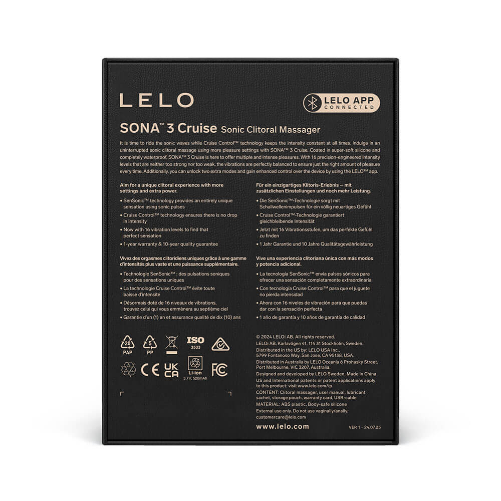 For even more versatility, the Sona Cruise 3 is compatible with the LELO app, which lets you unlock extra features like "Finish Me O" and "Out Of Control" modes, as well as the Love Bridge function for long-distance connection. Whether you’re using it alone or with a partner, these added features open up a whole new world of interactive pleasure.